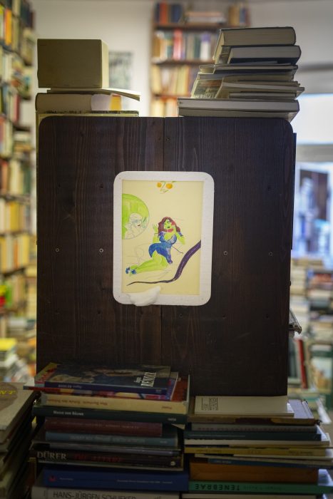 Advancing together, 2022, Public Fictions, Leverkusen, Performance Documentation and Installation View, Performed and read by Fiona Metscher, Drawings shown at Zentralantiquariat, Curated by Lisa Klosterkötter, Leverkusen, Photo: Public Fiction