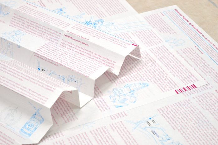 Advancing together, (package leaflet), digital print on medical package leaflet paper, 29,7 x 42 cm, 2022, Publication for Public Fictions, Leverkusen, 2022, Curated by Lisa Klosterkötter, Leverkusen, Photo: Albi Fouché