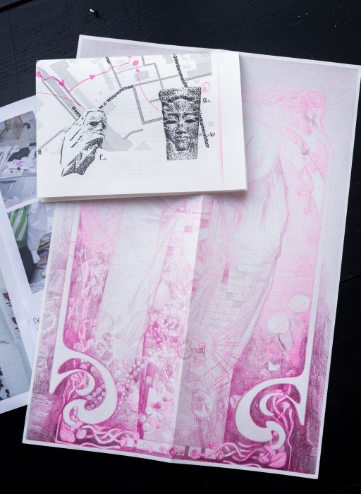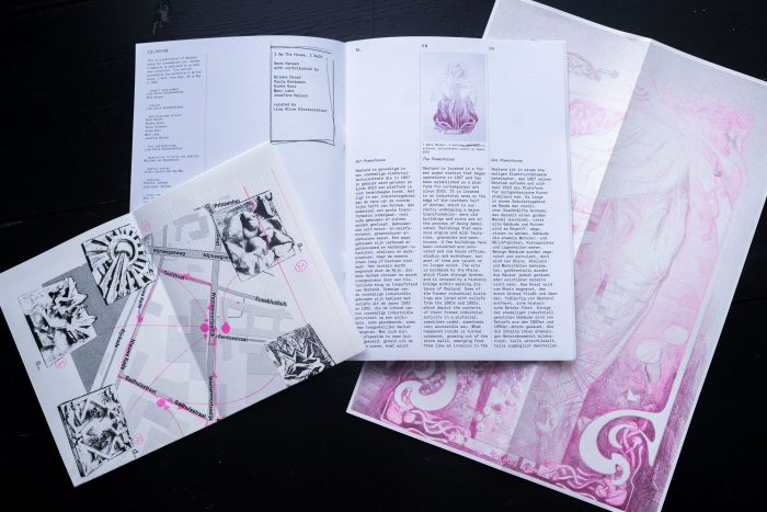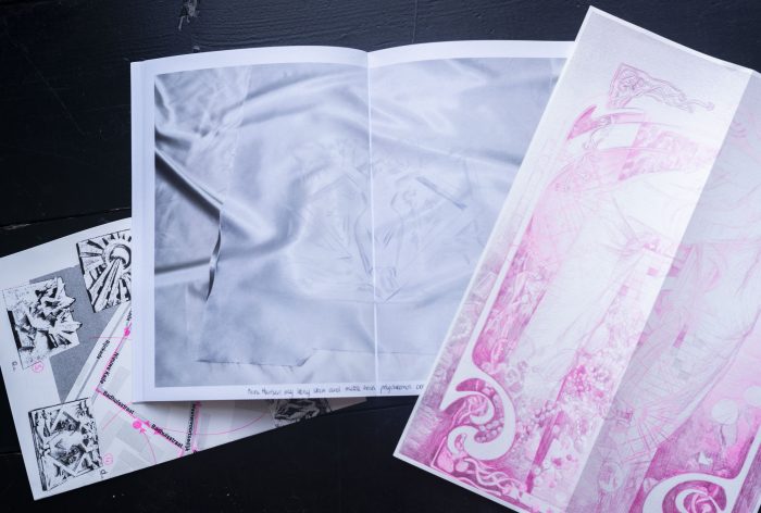 A publication accompanying the exhibition, featuring research material, the central narrative, accompanying texts, and drawings.