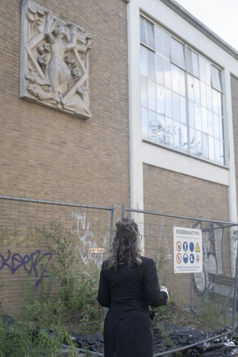 The reading of the text I Am the House, I Said unfolds across various locations within the surrounding neighborhood of Omstand. Written from the perspective of the former power station Ondrestation P.G.E.M. (now Omstand – Space for Contemporary Art), the narrative unfolds around the arrival of an intricate glass ship on Earth. After a period of silence, the ship appears to make contact with the buildings through dreams, which seem to materialize as reliefs on the walls of the former industrial structures. The text animates the voice of the architecture, paying deep, loving respect to the material memory embedded within the buildings.