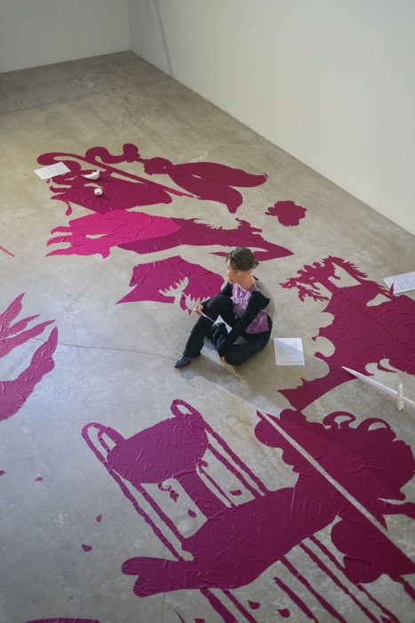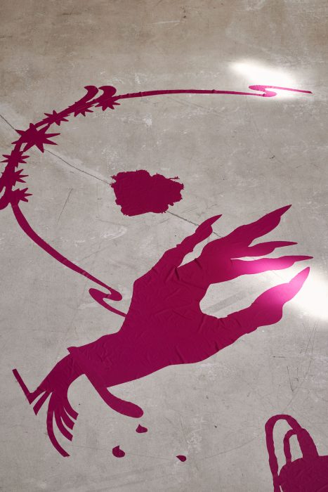 Subconscious (2020 -) by Nora Hansen is a site-specific and participatory installation only complete with the metamorphosis its visitors undergo. The installation features drawings and objects, fragments echoing legends, tales and myths from the past and the present. The magenta dominating the works, as a supposedly neutral color spectrum underlying the construction of all digitally printed images (CMYK), has recently found its way into Hansen’s artistic processing.